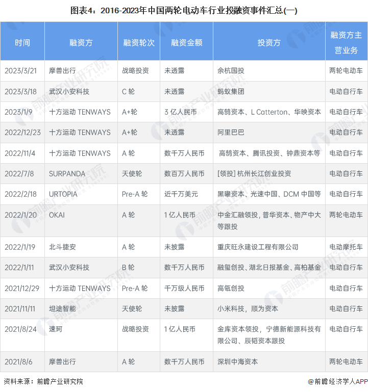 4、电动自行车企业获投次数最多