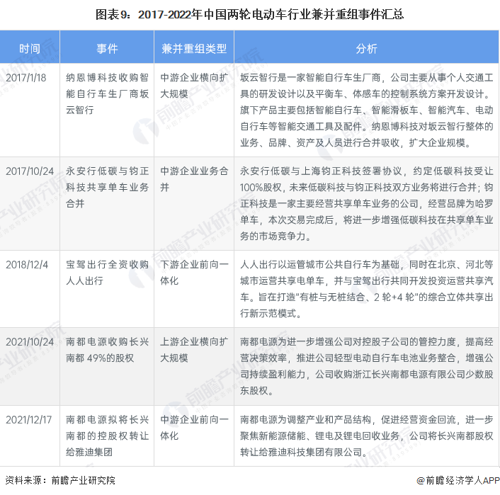 与投融资事件相比,两轮电动车行业兼并重组事件热度较低,近年进行兼并重组活动的企业较少,仅有部分中游企业前向一体化布局或收购业内企业以扩大企业规模,增强企业经营能力。