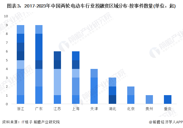 3、浙江和广东地区两轮电动车行业投融资事件最多