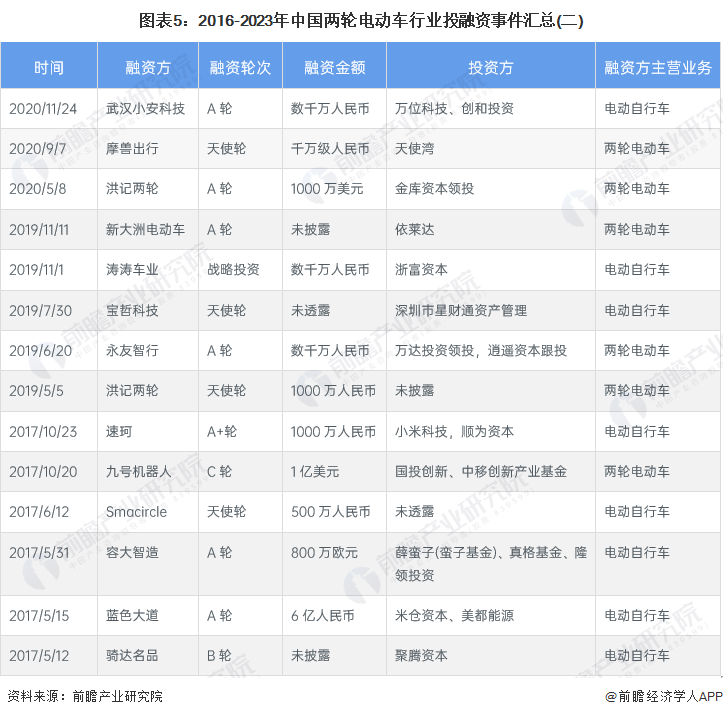 中国两轮电动车行业投融资事件数量较多,获投企业大多以研发生产电动自行车为主,部分企业为两轮电动车即电动自行车和电动摩托车等厂商。