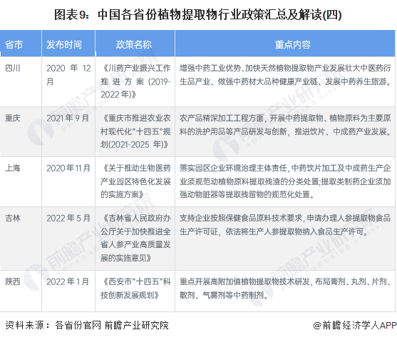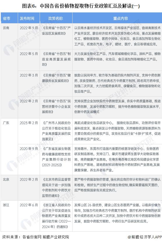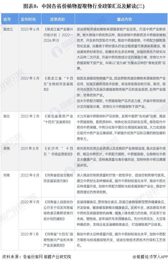 现阶段出台植物提取物相关政策的省份多基于区域内特色植物提取物或产业链优化需求进行相关布局,加大中药及生物医药全产业链布局。