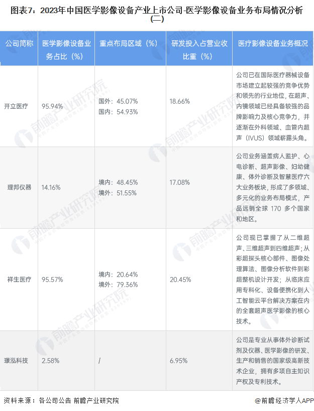 医学影像设备产业上市公司中,开立医疗医学影像设备业务占营业收比重最大,业务比较集中;就区域布局情况来看,医学影响设备绝大部分公司在国内外均有所布局,其中祥生医疗境外业务布局占比最大;就研发投入情况来看,祥生医疗研发投入占营业收入比重最大。
