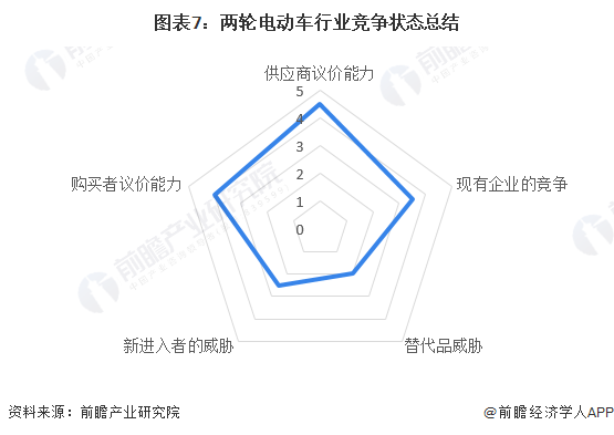 基于以上分析,对各方面的竞争情况进行量化,5代表最大,1代表最小,我国两轮电动车行业的整体竞争情况如下图所示: