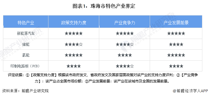 珠海市发布的《关于坚持“产业第一” 加快推动工业经济高质量发展的实施方案》中明确了“产业第一”的原则,把产业发展和园区建设作为经济发展主战场,努力打造 “4+3”产业集群。“4+3”产业集群是指新一代信息技术、新能源、集成电路、生物医药与健康4大主导产业,以及智能家电、装备制造、精细化工3大优势产业。前瞻根据政策支持力度、产业竞争力和产业发展前景三大指标体系,评选出了珠海市的特色产业为新能源汽车产业、储能产业、氢能产业以及印制电路板(PCB)产业。