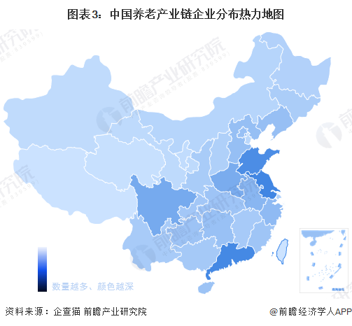 在企查猫平台对养老产业进行检索,数据显示,我国养老产业生产企业数量较多,江苏、广东、山东等区域养老相关企业较多。另外,相关代表性企业大多集中在北京、上海、广东、江苏等地。