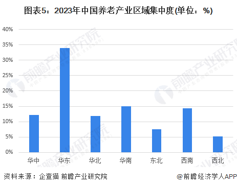 从区域集中度来看,我国养老产业区域集中度最高的是华东地区,占比约34%;其次是华南地区,达15%,西南地区达14.3%,华中地区达12.2%,华北地区达11%,东北地区和西北地区分别7.6%和5.1%。行业整体集中度偏高。