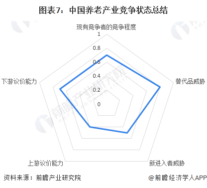 从五力竞争模型角度分析,养老产业的替代品为智能养老行业,但养老行业未来的大趋势之一就是智能化,因此行业的替代品威胁较大;行业市场集中度偏低,竞争较为激烈;行业上游供应商较多,产品可替代性高,因此行业供应商议价能力一般;下游购买者对产品、服务的选择面较广,议价能力较强;同时,国家逐步加大对养老领域的政策扶持力度,鼓励和引导社会资金投入,潜在进入者威胁较高。