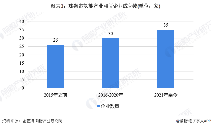 近两年氢能产业相关企业数量增长迅速,根据企查猫所查询的珠海市氢能产业相关企业数量,珠海市氢能相关企业共91家,其中2015年之前成立企业26家,2016-2020年期间成立的企业30家,2021至今成立企业35家,可见近两年来珠海市氢能产业相关企业数量迅速增长。