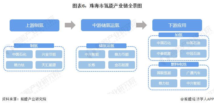 目前,氢能产业链主要分为上游制氢,中游储氢运氢以及下游应用三个方面,而珠海市在产业链的上中下游均有企业布局,已基本形成产业链,如上游制氢企业有中国石化、格力钛等,中游储氢运氢企业有金石能源、长炼等,下游应用企业主要是燃料电池如格力钛、中兴智能等,具体产业链全景图谱如下: