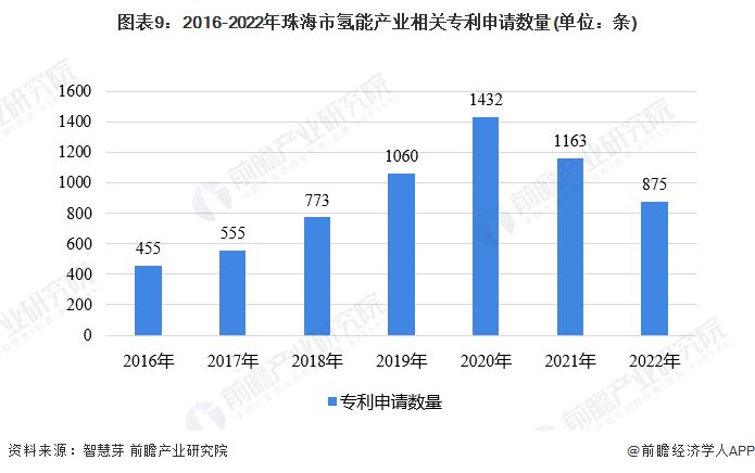 从申请年份来看,珠海市2016年以来专利申请数量逐渐增加,2016-2020年专利申请量逐年上涨并在2020年达到顶峰(1432条),可见近年来珠海市氢能产业创新能力的进步。