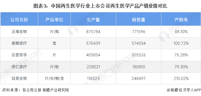目前,我国再生医学行业中主要的几家上市企业均通过研发、生产和销售再生用医疗器械产品实现收入,且多为植入性医疗器械,但在产品适用的病症上有所区别。如正海生物的活性生物骨产品用于骨科类疾病,佰仁医疗的人工生物心脏瓣膜产品用于心脏类疾病。从各企业产品的产销情况来看,2022年,受宏观经济和医疗行业采集等影响,正海生物、迈普医学、佰仁医疗的产品产销率均低于100%,产生一定存货;冠昊生物产销率达210.02%,实际上销量较上年是下滑的,主要系上年存在较大库存量,公司2022年减少产品生产。