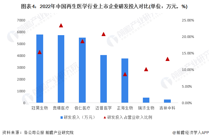从我国再生医学上市企业的研发投入来看,2022年,迈普医学、正海生物等A股上市企业研发投入均在3000万元以上,冠昊生物、奥精医疗和佰仁医疗的研发投入更是超过5000万元,研发投入占公司营业收入的15%以上;瑞济生物和吉林中科企业规模体量较小,为新三板挂牌企业,研发投入在200-500万元内,研发投入占比超过10%。目前,我国再生医学行业处于发展初期,随着再生医学企业研发投入的加大、创新能力的提升,以及一系列利好政策的支持,资本的加码,再生医学行业得以快速发展。