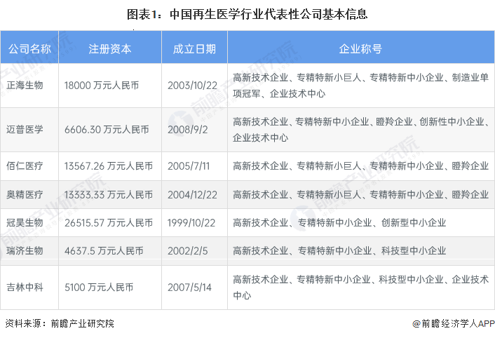 从再生医学行业的代表性企业布局和已有公开信息分析,注册资本较高的是冠昊生物,超过2.6亿元,成立时间较早的也是冠昊生物。企业称号方面,再生医学行业属于技术型行业,企业若想在行业中获取一定的市场优势,技术能力需处于行业前列,因此再生医学行业上市企业主要获得高新技术企业、专精特新、企业技术中心等称号。