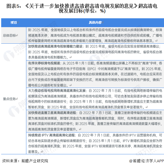2022年6月,国家广播电视总局发布《关于进一步加快推进高清超高清电视发展的意见》,提出到2025年全国地级及以上电视台和有条件的县级电视台全面完成从标清到高清转化,标清频道基本关停,高清电视成为电视基本播出模式,超高清电视频道和节目供给形成规模。广播电视传输覆盖网络对高清超高清电视承载能力显著增强,高清超高清电视接收终端基本普及的总体目标。