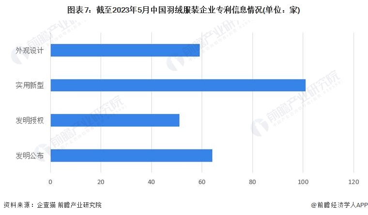 根据中国企业数据库企查猫,目前存续和在业的羽绒服装企业中132家企业有专利信息。其中,专利类型为发明公布的有64家,51家企业拥有发明授权,101家企业拥有实用新型专利,59家企业拥有外观设计专利。