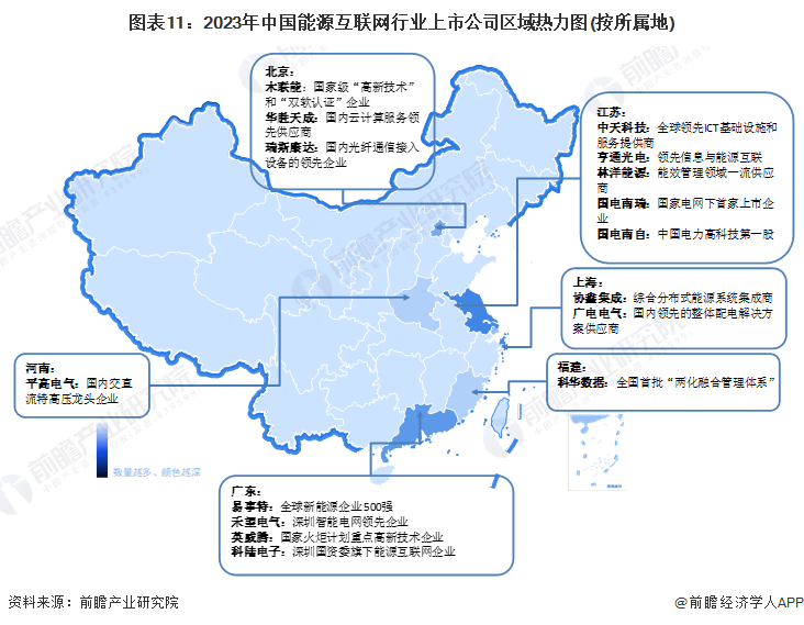 从上市公司的区域分布来看,我国能源互联网相关企业主要集中在广东、江苏、浙江、上海等地区。其中,广东易事特(300376)、科陆电子(002121)等企业是能源互联网行业领先企业;江苏省的国电南瑞(600406)、国电南自(600268)综合性企业为行业龙头。