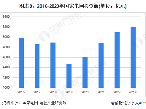 据国家电网数据,2016-2022年,国家电网公司电网投资额呈先下降后上升趋势,2022年电网投资创下新高,投资额达5094亿元;2023年,这一数字将达到5200亿元,计划投资额同比增长约4%。