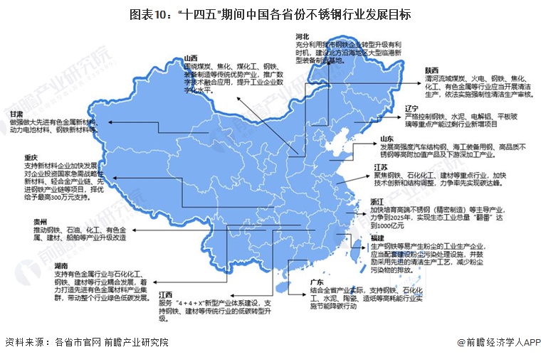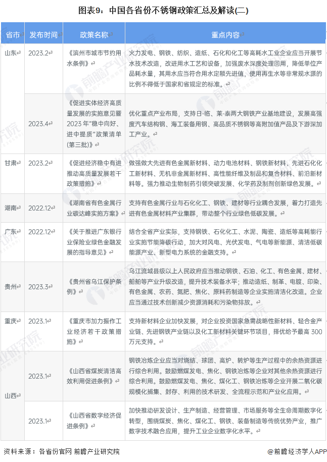 除了中共中央、国务院等部门颁布一系列政策外,各省市同样出台了一些举措来指导不锈钢行业的发展。主要方向为淘汰落后产能、推进行业企业转型升级,引导不锈钢行业绿色化发展。