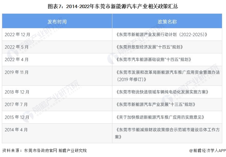 东莞市的新能源汽车产业相关政策中,前期政策主要集中在新能源汽车生产技术指导领域,2017年开始政策逐渐偏向新能源汽车充电桩建设和传统汽车清洁能源替代、“低碳”交通发展领域。相关政策汇总情况如下: