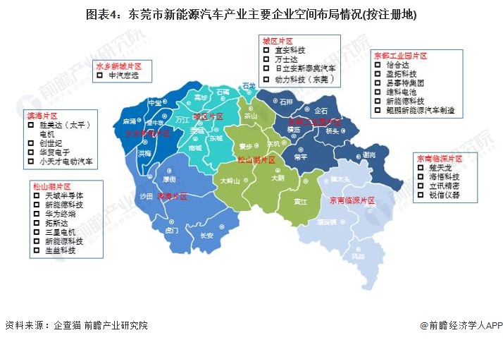 东莞按照“多中心、分片区、网络化”的发展理念,加快建设中心城区、松山湖、滨海湾新区“三位一体”的都市核心区空间格局和“三心六片”城市格局,六大片区分别为城区片区、松山湖片区、滨海湾片区、水乡新城片区、东部产业园片区和东南临深片区。从产业链各环节的代表性企业分布地图来看,目前东莞市各片区均有新能源汽车相关企业布局,相对而言,松山湖片区的产业链企业布局更完善。