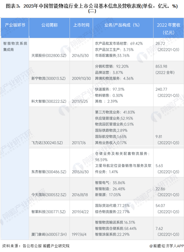 行业主要上市公司:东杰智能(300486)、佳顺智能(834863)、机器人(300024)、怡亚通(002183)、中储股份(600787)、诺力股份(603611)、飞力达(300240)、嘉诚国际(603535)、天顺股份(002800)、今天国际(300532)、德马科技(688360)、音飞储存(603066)、华鹏飞(300350)、兰剑智能(688557)等。