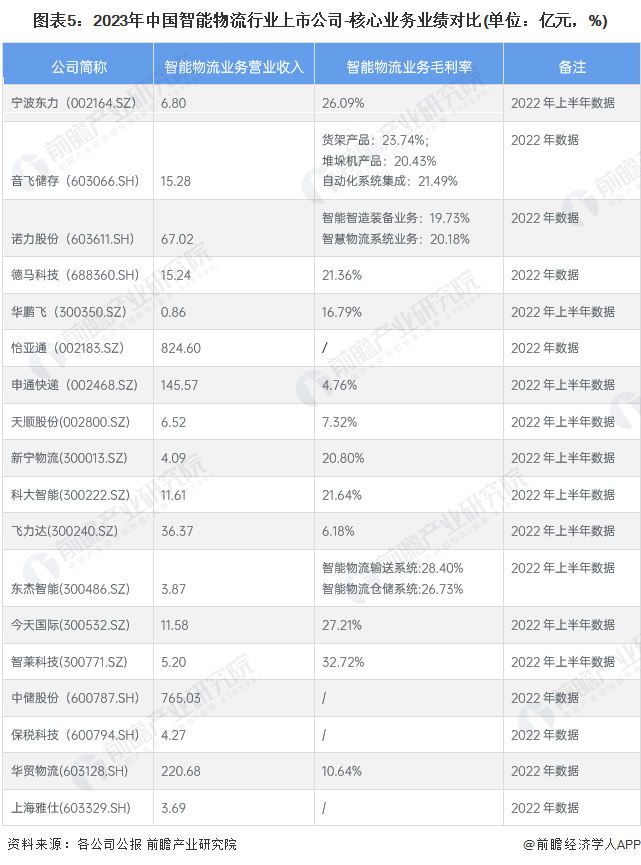 由于所处产业链位置不同、涉及业务深度不同,业内企业智能物流相关业务业绩悬殊,怡亚通2022年智能物流业务业绩高达824.60亿元。