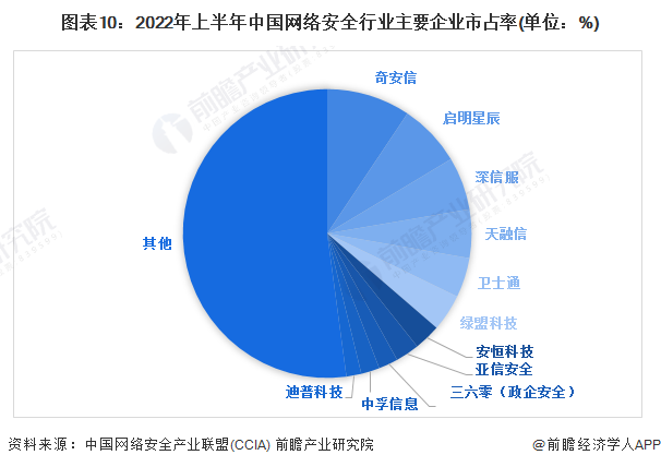 2022年6月23日,中国网络安全产业联盟(CCIA)发布《2022年中国网络安全市场与企业竞争力分析》报告,统计显示,2022年上半年,4家网络安全头部企业的市占率之和已超过市场总额的四分之一,奇安信、启明星辰、深信服和天融信四家公司市场占有率均达到或超过5%,其中奇安信一家就达到9.5%。