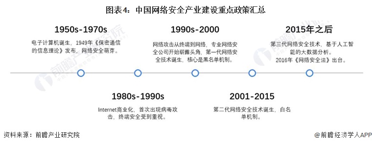 随着第一台电子计算机的诞生,网络安全行业的发展亦拉开的序幕。二十世纪八九十年代,由于互联网开始商业化,首次出现了病毒攻击终端事件,故终端网络安全受到重视。在千禧年之后,随着互联网的商业化以及网民规模的快速增长,第二代网络安全技术诞生,核心为白名单机制,主要由于蠕虫、病毒可大规模通过网络攻击,第一代的黑名单机制已无法奏效。2014年,网络安全上升为国家战略。2015年之后,基于人工智能的大数据分析作为第三代网络安全技术诞生,2016年《网络安全法》出台,网络安全行业进入“黄金十年”。