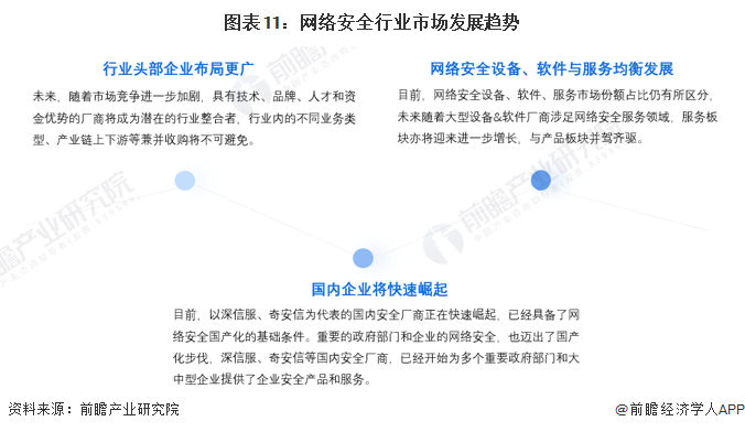 从我国网络安全行业的发展趋势来看,第一,行业头部企业布局将呈“横向+纵向”发展,一方面从自身业务辐射到设备、软件、安全三种类型业务,另一方面对产业链上游业务进行纵向布局以降低成本;第二,随着政策支持力度加大,加之企业自身的发展,国内企业将快速崛起;第三,随着企业对自身业务布局,推动行业中游类型均衡发展。