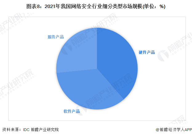 根据IDC统计数据,2021年我国网络安全市场规模为122.0亿美元,其中硬件产品市场规模最大,为47.0亿美元,占比为38%,其次是软件产品,市场规模为42.4亿美元,占比35%,服务产品市场规模为32.4亿美元,占比为27%。整体来看,网络安全行业市场之间呈“三足鼎立”态势。