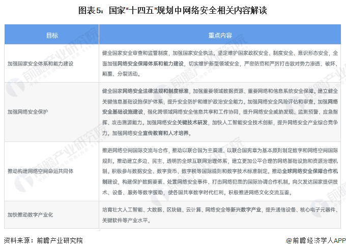 2021年8月20日,我国发布了《中华人民共和国个人信息保护法》,确立了确立个人信息保护原则以及禁止大数据杀熟等现象,进一步完善了我国个人信息保护,肃清网络环境。从我国“十四五”规划内容可以看出,我国从基础设施建设、保障体系构建、人才培养、宣传教育、全球合作等方面进行网络安全行业的布局与发展,将网络安全提升到战略新兴产业的高度。
