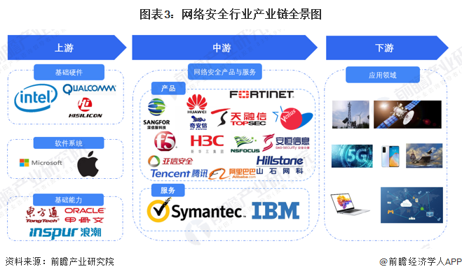 从具体的相关厂商来看,上游设备/系统提供商有英特尔(INTC)、高通(QCOM)、微软系统(MSFT)、苹果系统(AAPL)、甲骨文(ORCL)等厂商,中游有深信服(300454)、天融信(002212)、奇安信(688561)、启明星辰(002439)等著名厂商,下游包括5G、互联网等细分市场的应用。