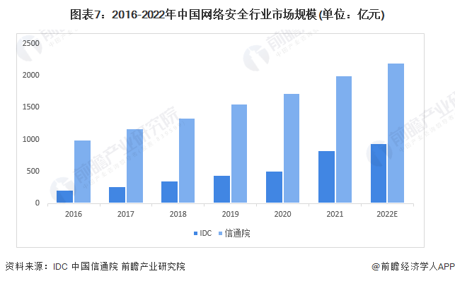 注:信通院统计口径对网络安全产业范畴进行了扩充,将例如区块链应用等安全新技术产品、密码产品和设备等信息安全产品纳入考量范围,同时将云服务企业、电信运营商、车联网企业等主体的网络安全业务也纳入计算范围;IDC统计口径为中国网络安全支出规模,包含软件、硬件与服务支出,2022年IDC测算规模已根据2022年美元兑人民币平均汇率换算。