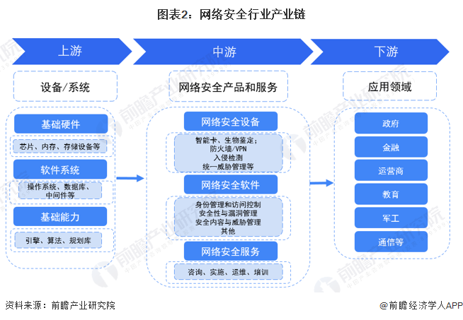 随着国家对互联网安全、个人隐私安全等相关方面的政策出台,网络安全相关产业也随之强大起来,在保障国家、社会和个人的信息安全发挥重大作用的同时,亦推动了相关产业链的发展。从网络安全产业链看,上游为设备/系统等供应商,如芯片、内存、操作系统、引擎等;中游为网络安全产品和服务厂商,如网络安全设备领域的防火墙/VPN,软件领域的安全性与漏洞管理以及服务领域的运维培训等;下游为应用领域,除个人消费者外,还包含政府、军工、金融等相关领域。
