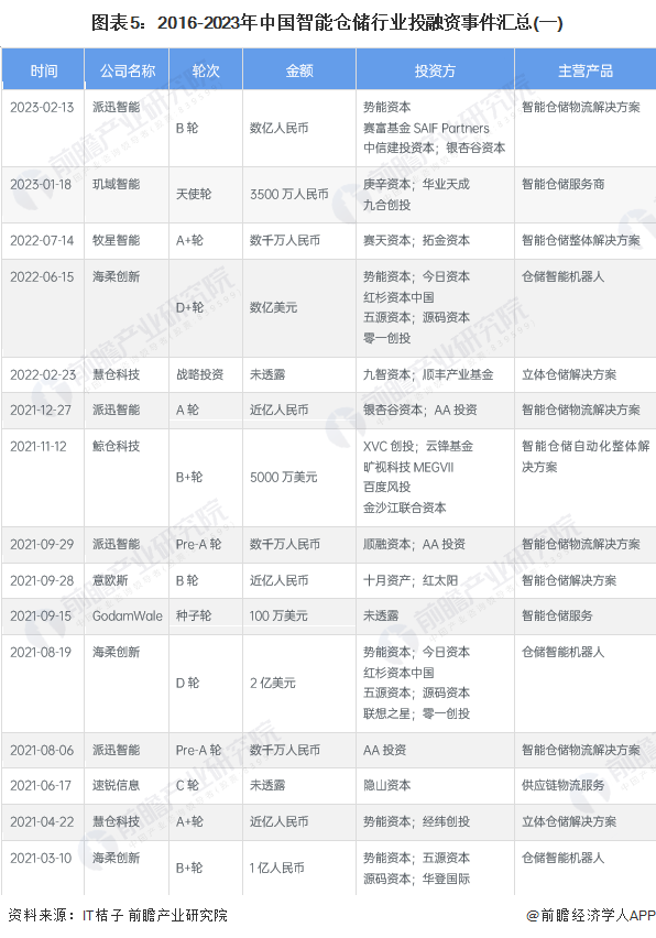 从2016-2023年融资企业的主营产品分析,投资热点主要集中主营业务为智能仓储解决方案的企业。