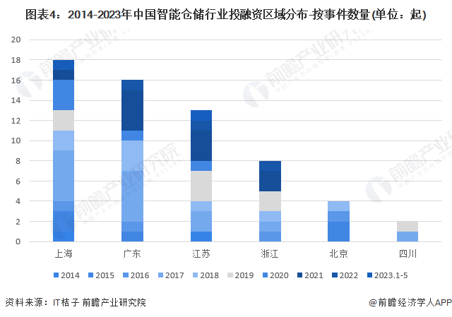 3、智能仓储行业投融资集中在上海、广东和江苏