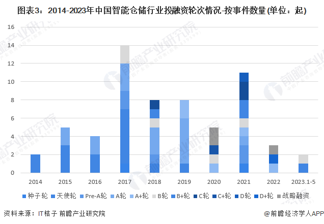 从智能仓储的投资轮次分析,目前智能仓储行业的融资轮次仍然处于早期阶段,C轮后的融资事件数量较少。