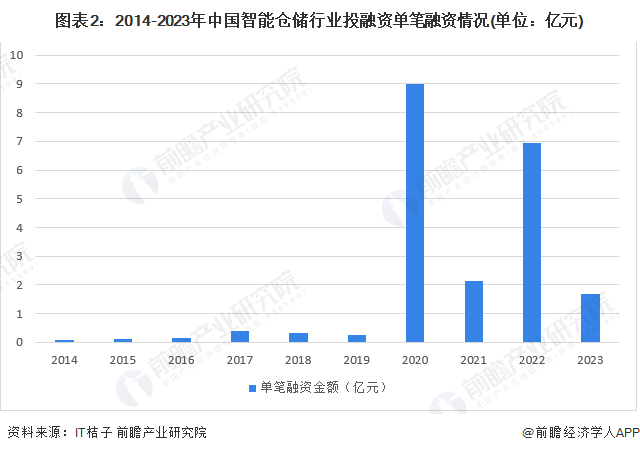 从单笔融资金额来看,2014-2023年除2020年和2022年的单笔融资金额上升到6亿元以上外,其他年份的单笔融资金额均未超过6亿元。2020年单笔融资金额上升至9亿元。