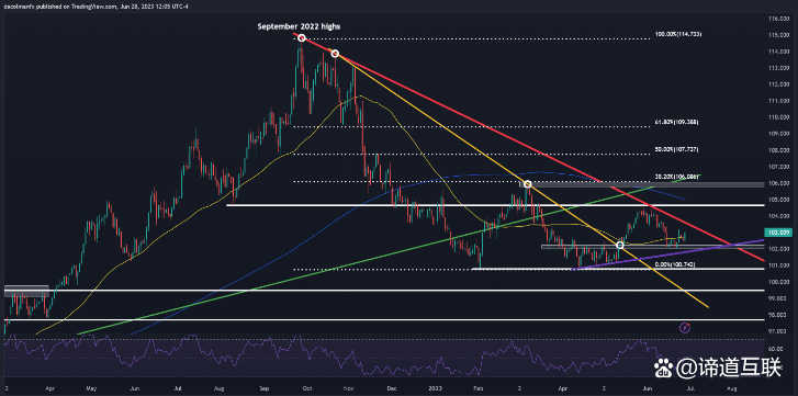 继近期展开反弹后,美元指数(简称美指,DXY)正稳步奔向中期趋势线阻力103.50一线,虽然美元多头想要推动价格突破这一技术阻力可能会面临一定的困难,但一旦突破便有望吸引更多新买家涌入市场从而为进一步上探104.70(5月震荡高位附近)埋下铺垫。