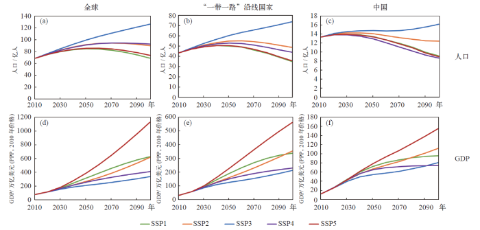图1 SSP1~SSP5情景下2020—2100年全球、“一带一路”沿线国家和中国的人口和GDP变化注:PPP(Purchasing Power Parity)为以够买力平价计算的GDP。Fig. 1 Change of population and GDP for the world, the “Belt and Road” countries and China from 2020 to 2100 under SSP1-SSP5