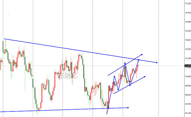 原油今日震荡上涨,在触及70.3美元/桶之后,多头出现了上涨延续,突破了前期阻力位走高,最高点触及72.0美元/桶遇阻调整。原油近期出现了震荡上涨走势,延续了三角调整的上涨幅度,油价在67.0第三次触及后,多头出现了三轮上涨推动,今日强弱以现在72.8美元/桶阻力,突破之后油价下一站在73.3美元/桶。综上所述张融亿总结:原油多头出现延续,后市操作上考虑回撤布局多单为主,反弹高空为辅,上方关注72.8-73.3美元/桶阻力,下方关注70.9-70.3美元/桶。