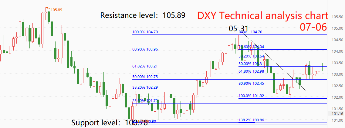 技术角度看,美元指数的反弹走势尚未结束,但上方阻力位重重,上涨进程将多有反复。5月31日至6月22日的回调波段,最低触及101.89点,达到前期上涨波段的0.618~0.764重要分位区间内,回调已经非常充分。在如此稳固的多头结构下,本月有可能刷新6月份的高点纪录。最新市价103.36,短期阻力位103.64,短期支撑位102.98点。