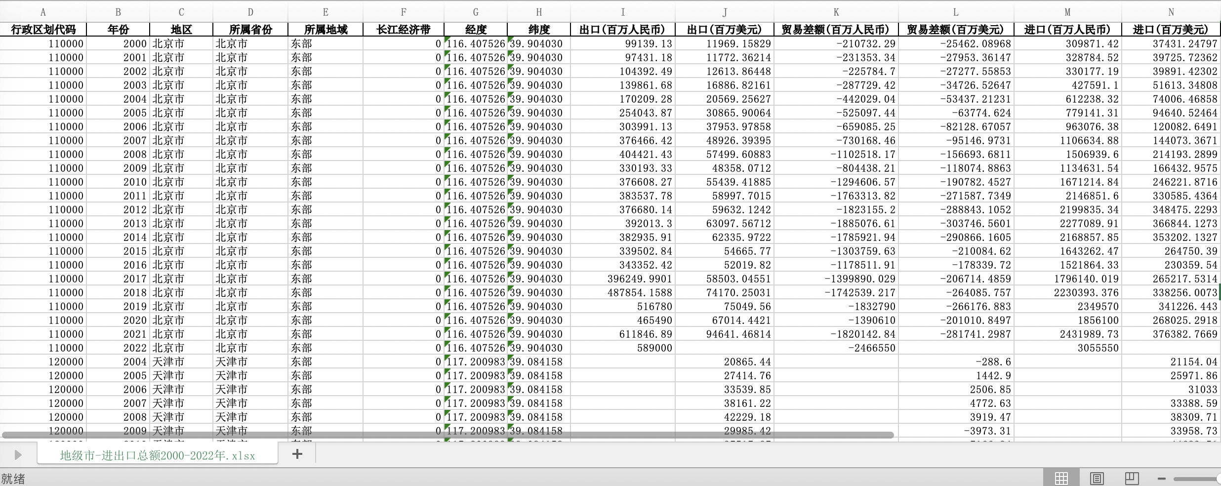 数据名称:全国298个城市地级市进口出口额进出口贸易差额Excel面板数据(2000-2022年)