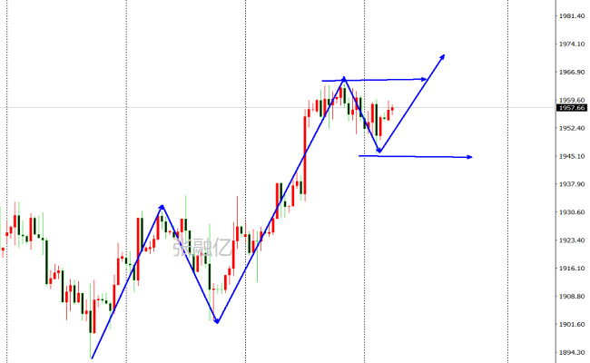 昨日黄金市场延续区间盘整,早盘开盘在1954.5美元/盎司,后行情先回给出1950附近的短期支撑后行情快速拉升,日线最高触及到了1960美元/盎司,后行情受到日线技术压力和短期基本面影响行情快速回落,日线最低给到了1945.5美元/盎司,后尾盘二次拉升,日线最终收线在了1955美元/盎司,后行情以一根下影线稍长于上影线的长脚阳十字星形态收线,而这样的形态收尾后,延续看涨思路。4小时图开始横向整理当中,短线多头放量后开始收缩整理蓄势。短线作为反转多头。三浪上涨结构中停顿修正蓄势,再为五浪上涨做准备。破高点1940将转换为强支撑点。综上所述张融亿总结:黄金延续看涨思路,今日操作上考虑回撤布局多单为主,高空为辅上方关注1963-1970美元阻力,下方关注1945-1930美元支撑。