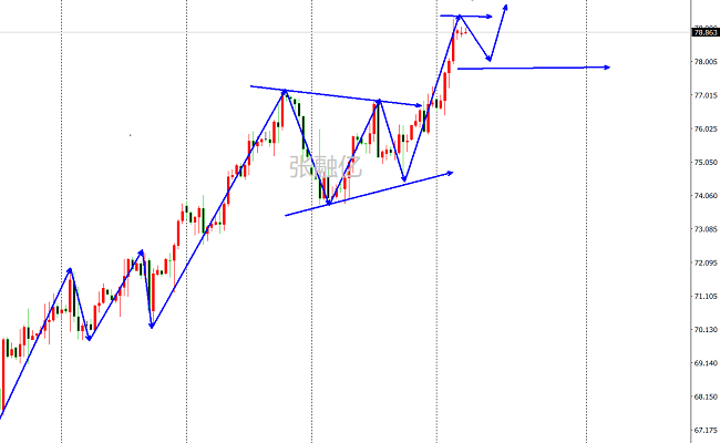 昨日美原油市场早盘开盘在78.86美元/桶,后行情先回落,日线最低给到了78.3美元/桶,后行情强势拉升,日线最高触及到了79.96美元/桶,后行情整理,日线最终收线在了79.38美元/桶,后行情以一根上下影线基本等长的纺锤形态收线,而这样的形态收尾后,原油延续看涨。4小时图整理式慢涨,单阳放量后再陷入回踩确认。一步一停顿的震荡上升走法。目前中轨做为多头生命线。中轨之上保持低多,首先昨日的低点78.30依旧是今日的支撑点。综上所述张融亿总结:原油延续看涨思路,今日操作上考虑回撤布局多单为主,高空为辅,上方关注80.5-83.3美元阻力,下方关注78.3-77.3美元支撑。