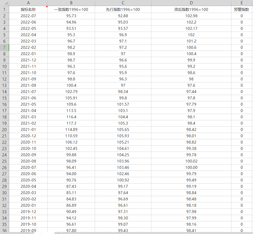 指标名称:一致指数1996=100、先行指数1996=100、滞后指数1996=100、预警指数