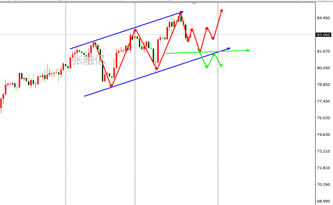 上周五原油持于来回运行,周线级别录得带上下影线的小阳,上周先涨后跌,周线收十字K。日线上,目前原油上行遇阻回撤,短期还是偏向高位横盘运行;周四冲高后出现回落,周五震荡。短期走势是回踩,突破前高后的回踩动作。目前整体油价大趋势处于上升线之上运行,周初短线可能先回踩确认上升趋势线的支撑。目前日线连阳之后转小阴K线修正,目前调整的空间还不足以形成顶部,只是当作局部的回调修正。周初围绕通道趋势线布局。综上所述张融亿总结:原油处于冲高遇阻阶段,大趋势的改变还需要破点破线,今日操作上考虑反弹做空为主,低多为辅,上方关注83.8-84.2美元阻力,下方关注82.0-81.1美元支撑,进一步下破之后油价有望出现加速。