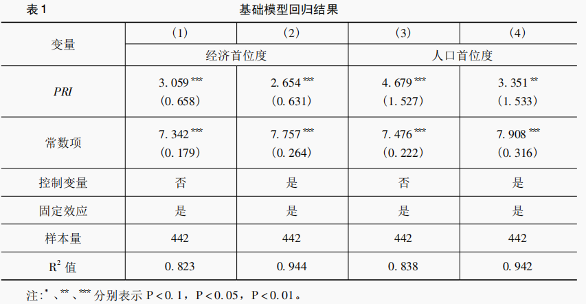 从表1可知,控制个体和年份固定效应后,省会首位度对区域创新绩效具有显著的正向影响。上加入控制变量结果,省会首位度对区域创新绩效的正向影响依然显著。使用人口首位度做自变量,结果依然支持省会首位度对区域创新的促进作用。2.工具变量回归结果本文考虑到“强省会”战略与区域创新绩效之间可能存在内生性。一方面,省会首位度与区域创新之间可能存在反向因果,即区域创新能力较强的省份,有更多创新要素集聚到省会城市,进而提升省会首位度。另一方面,虽然本文回归结果中,对可能影响区域创新能力的变量进行了控制,但无法完全排除遗漏变量偏差。为此,本研究通过工具变量回归的方式对研究结果进行稳健性检验,本文将地形起伏程度与全国公路、铁路和内河航道的里程数之和的倒数乘积,作为经济省会首位度的工具变量; 将地形起伏程度与全国客运总量的倒数乘积,作为人口省会首位度的工具变量。