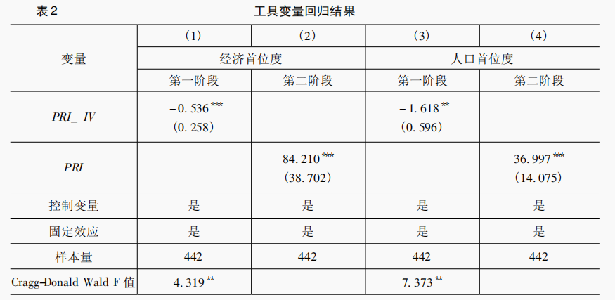 由于我国存在明显的地区发展不均衡问题,部分地区的工具变量与自变量之间的相关性不强,尽管第一阶段F值小于10,但在5%的水平上显著。工具变量回归结果表明,经济首位度和人口首位度对区域创新具有显著正向影响。