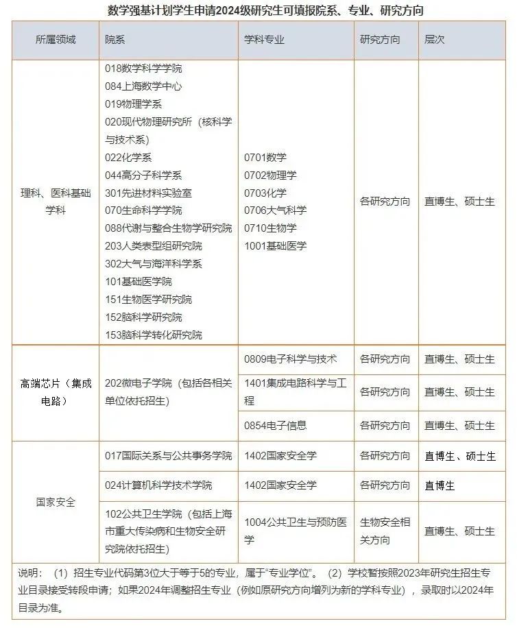 数学强基计划学生申请2024级研究生可填报院系、专业、研究方向: